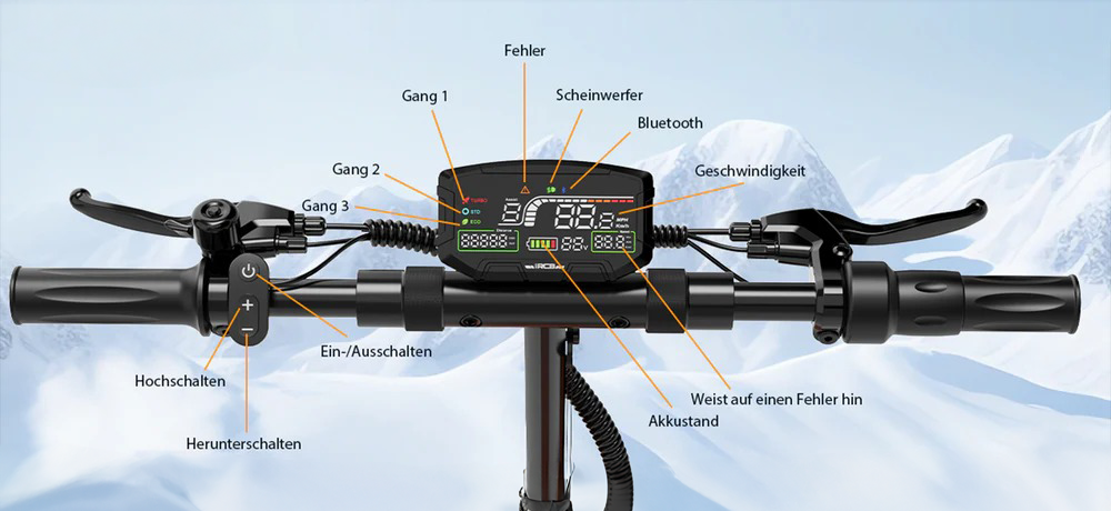 - Zeigt Geschwindigkeit, Akkustand, Fahrmodi & Kilometer